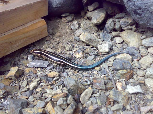 今日はいきなり大雨が降ったり陽が照ったり、蒸し暑かった;まあでも写真のニホントカゲ(幼体)には適度な湿度温度らしいです。目を向けると落ち着き無くヒョロヒョロ動いてどっか行きましたが・・・。
