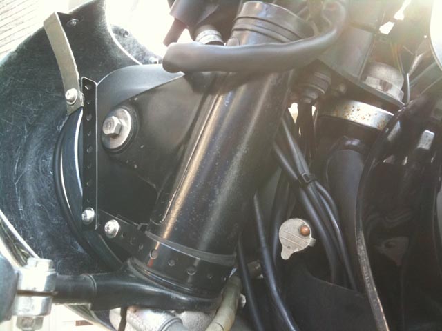 自分のR65に付いているビキニカウルは、ブルックランズのSR用(格好良いのでR26の時から欲しかった)です。自分で曲げ鈑切ってステーを作ったんですが、ヘッドライトケースの固定ボルトに挟む様にしてあったので、外すたびにライトの向きを調節しなきゃならん・・・えらい面倒;なので、新たに長めの曲げ鈑でフロントフォークから直接繋げるステーを作りました。まあ径が微妙に違うし無理矢理感は残ってますが良い感じ。