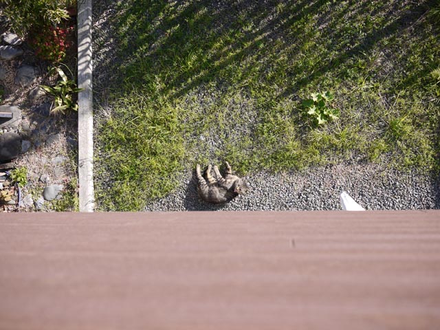 或る日人ん家の庭先に、横たわったままピクりともしない猫が居たんでじっと見ていたんですが、ちょっとやそっとの音では起きず心配になり、手を叩いて起こしました;陽当たりが良い処を渡り歩くんでまあ仕方無いけど、油断しすぎだろ(笑)