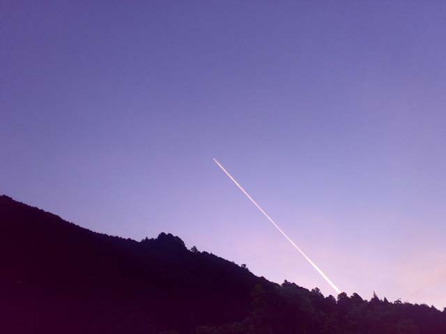 夜明け、陽の光から飛び出してきた様な光線です。空気が澄んでいて、真上に来たときにはジェット気流の本数と、飛行機のシルエットまで見えました。