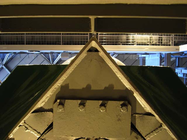 ・・・新幹線の200系(0系改・東北上越線)の先端部分を真下から見上げた処です。三角形部分がシャシー、その外側の2つの黒い台形が雪掻き部分です。僅かに鼻先も見えますが・・・。