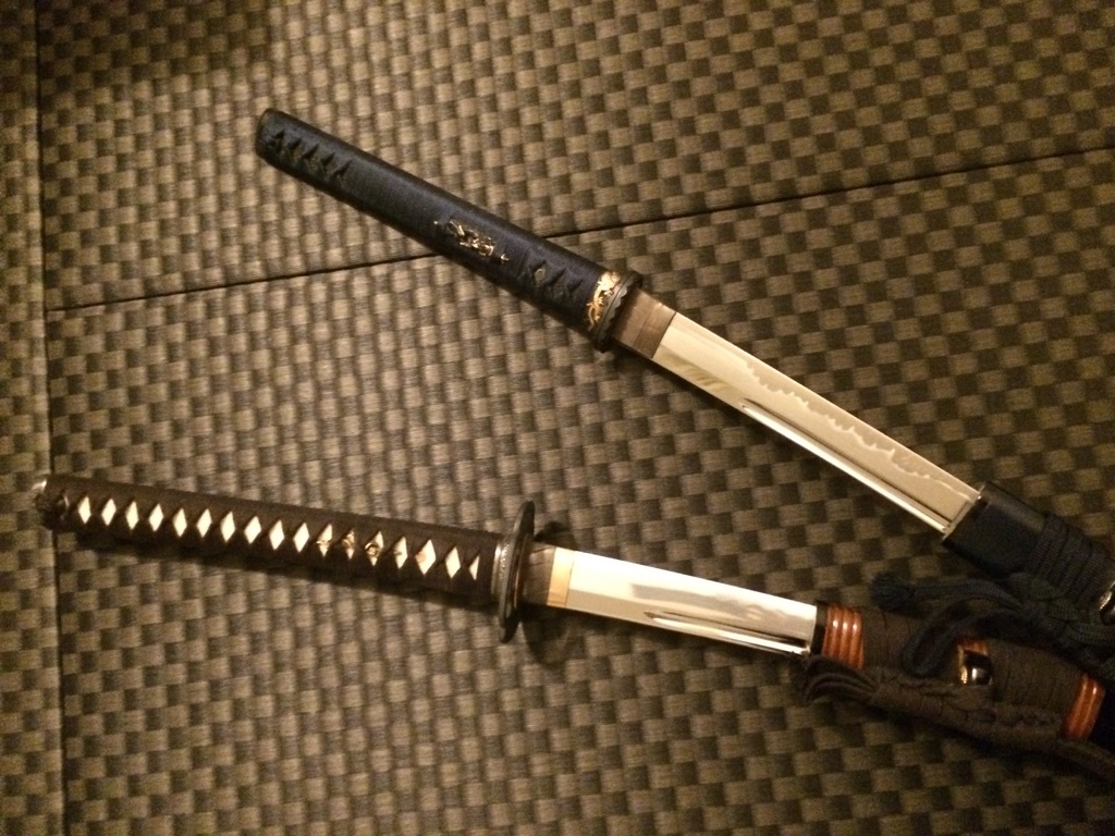 写真は愛刀の「一文字則宗」(上)と「同田貫正国」(下)の居合用模造刀剣で、以前セミオーダーで購入。7年前と14年前、だったかな?ま、居合を習ってはいませんが(笑)