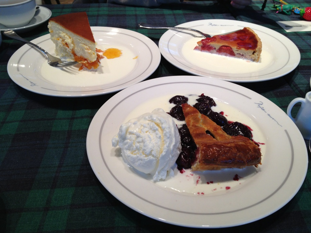 写真一番手前の「ダークチェリーパイ」です。パイの暖かい香ばしさとダークチェリーの甘酸っぱさとアイスクリームのコクと甘味で瞬殺;