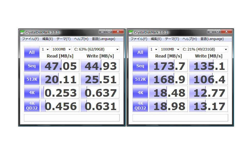 向かって左がHDD、右がSSDです。当然、数値が多い方が速いと云う事で。